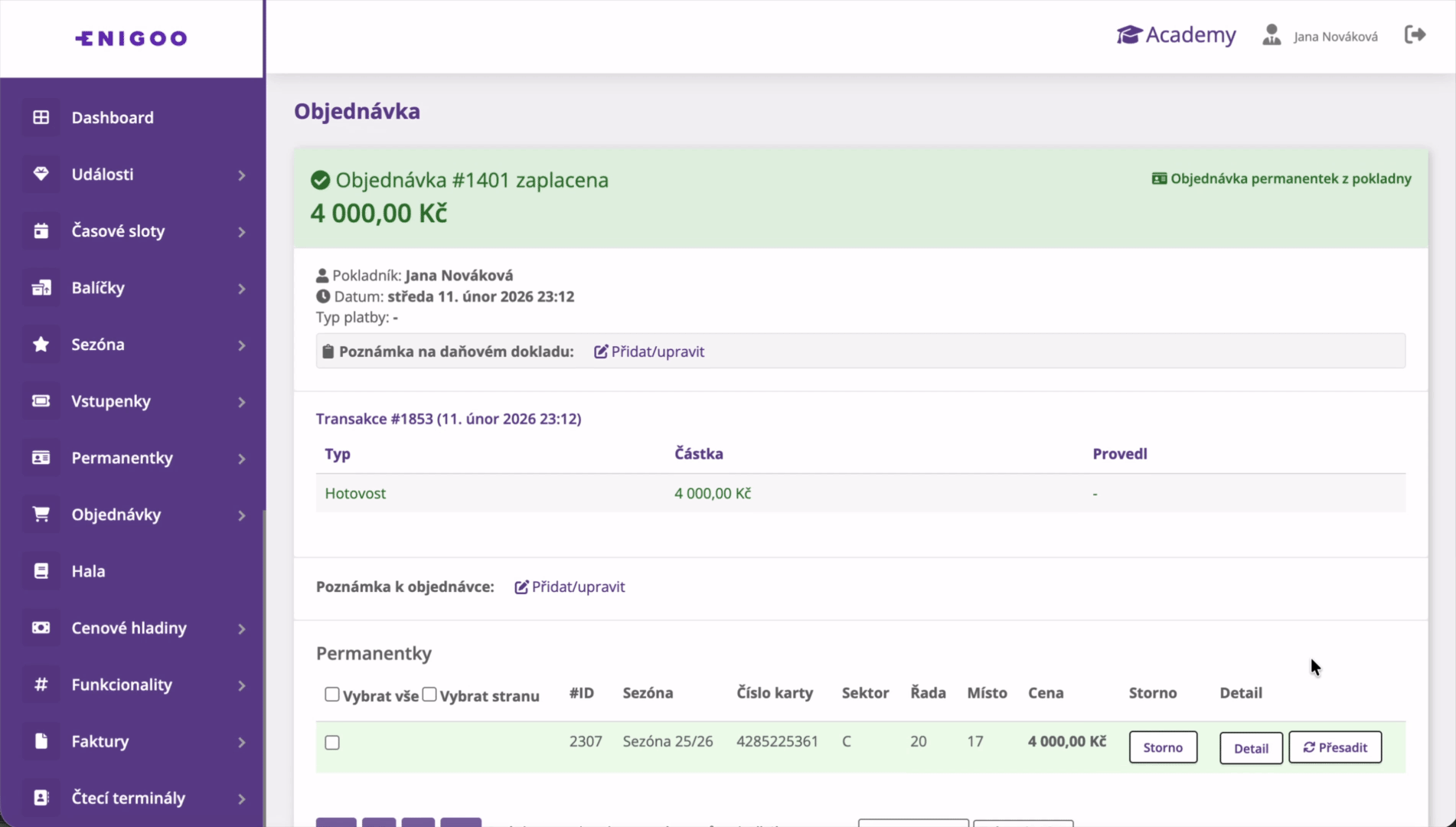 Do detailu objednávky jsme přidali možnost přesazení permanentky. Změna místa je nyní rychlá, přehledná a bez nutnosti vytvářet novou objednávku.