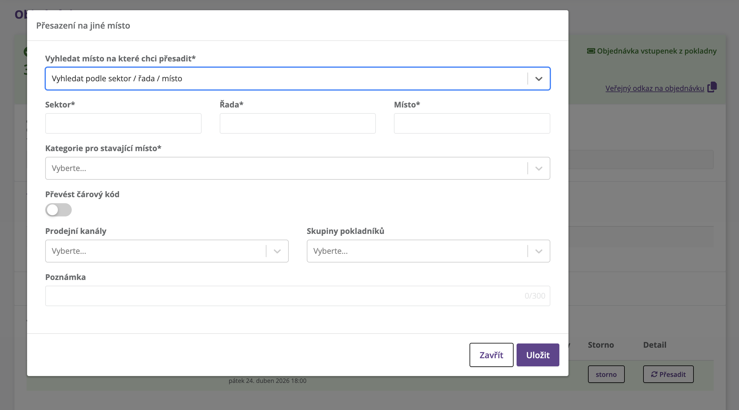 V detailu objednávky přibylo tlačítko „Přesadit“, které umožňuje změnit místo podle sektoru, řady, místa nebo ID vstupenky.
